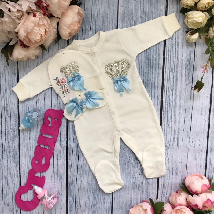 Комбинезон "Корона"+ шапка + царапки из интерлока-пенье. Украшен аппликацией из страз и бантами.